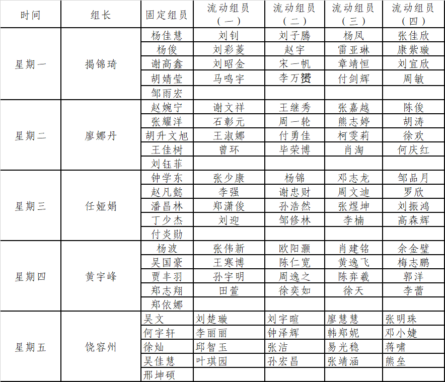 每组设立组长一名,负责统筹协调小组工作,定期向老师汇报工作进展。小组成员分成五个小组,每天安排一组进行监督工作,每组负责一天的课堂纪律监督任务。每个小组内部再进行具体分工。一个小组(组长+组员)共十人,四周一个周期循环。现将十大买球官方网站2024年秋季学期课堂纪律监督小组名单及安排公布如下。