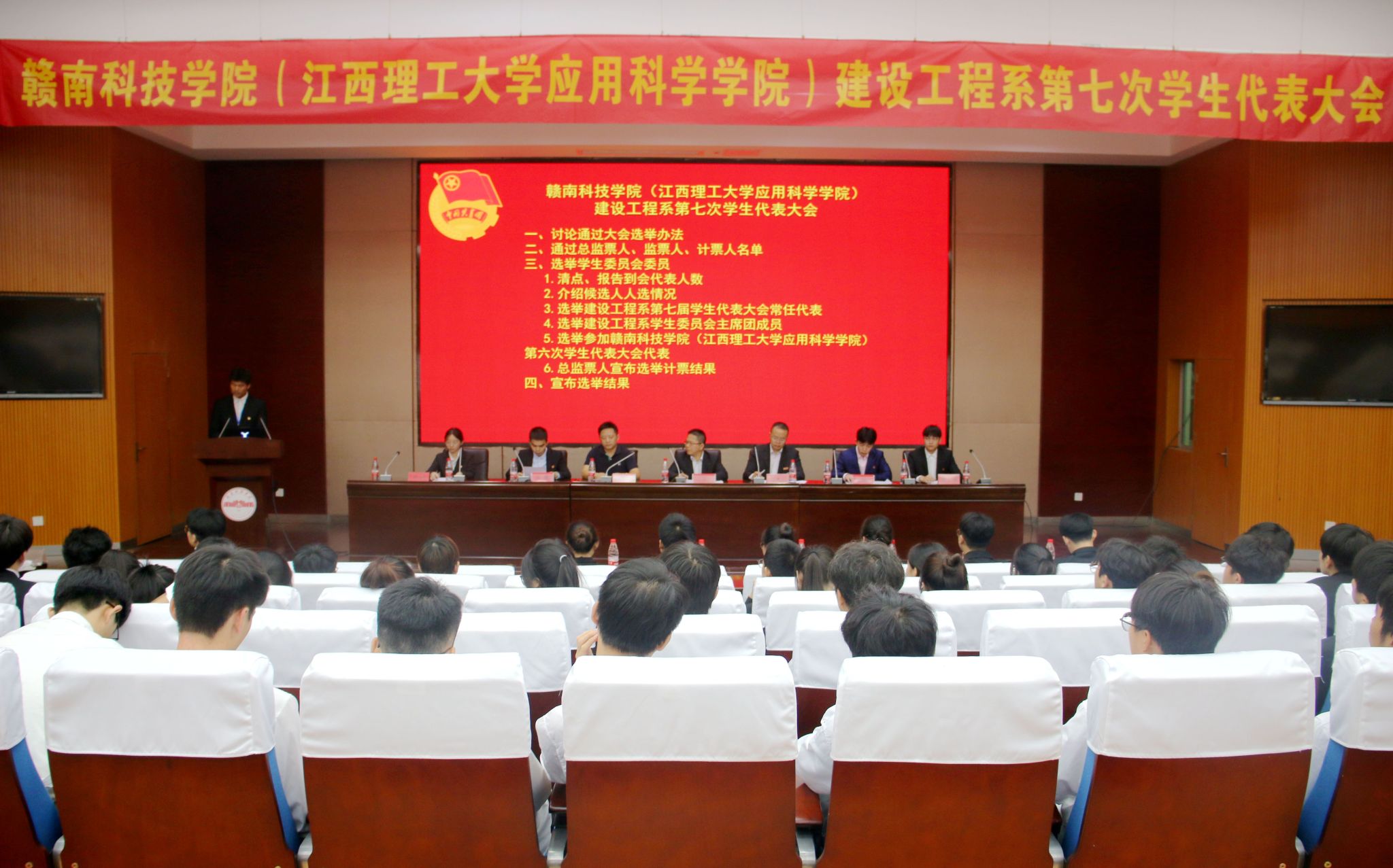本网讯:10月29日晚,建设工程系第七次学生代表大会在逸夫楼学术报告厅顺利召开,建设工程班子成员卢志刚、涂黎明、代靖怡,团总支书记刘辉以及35名代表出席本次大会。