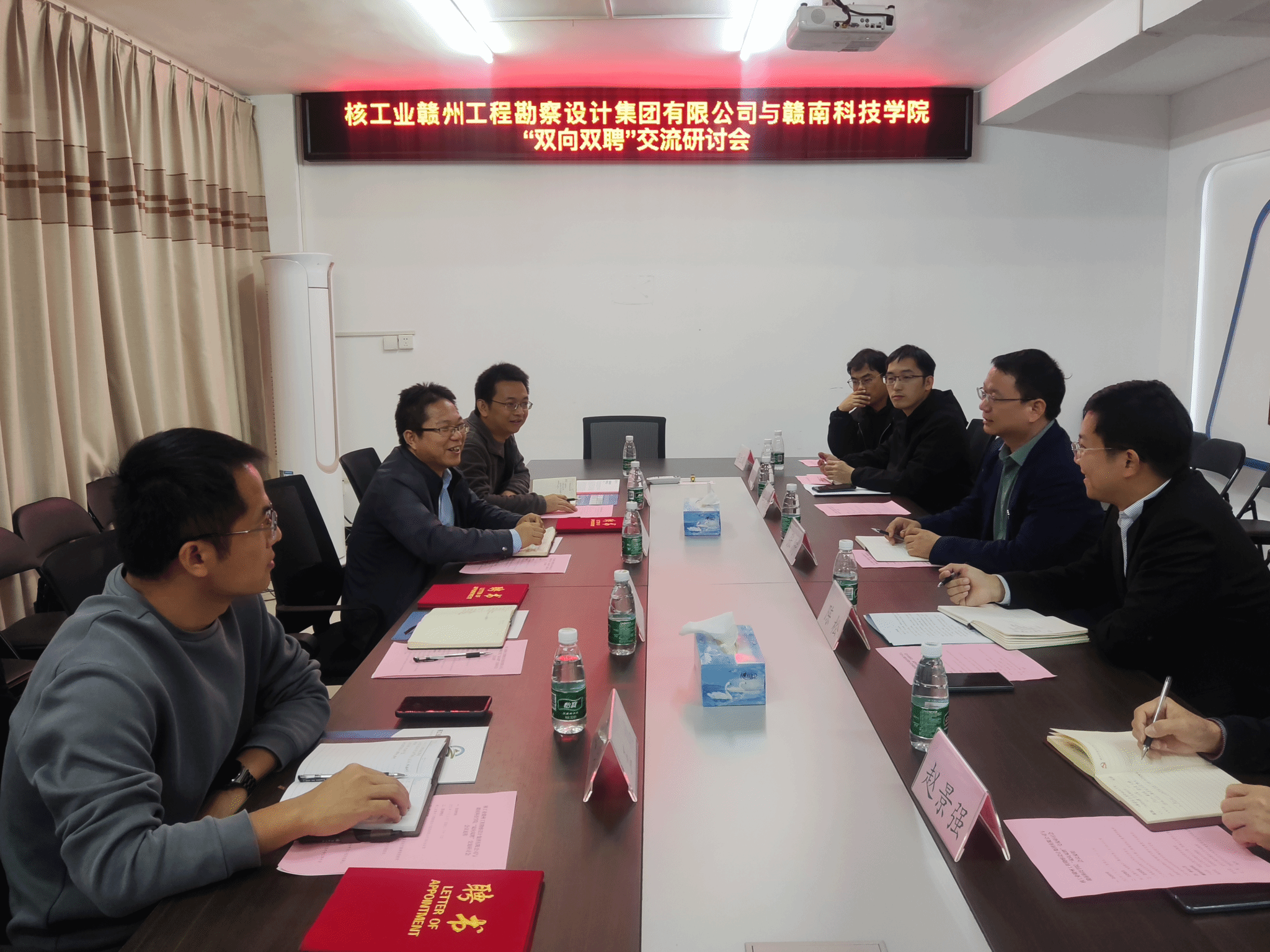 本网讯:为进一步深化校企合作,促进就业工作、产教融合落实落地,11月24日下午,建设工程系主任卢志刚一行赴核工业赣州工程勘察设计集团有限公司(下称“核工业勘察公司”)开展“双向双聘”交流研讨及调研工作。核工业勘察公司执行董事张衎、总经理陈松热情接待了卢志刚一行,双方在公司会议室进行了交流研讨。