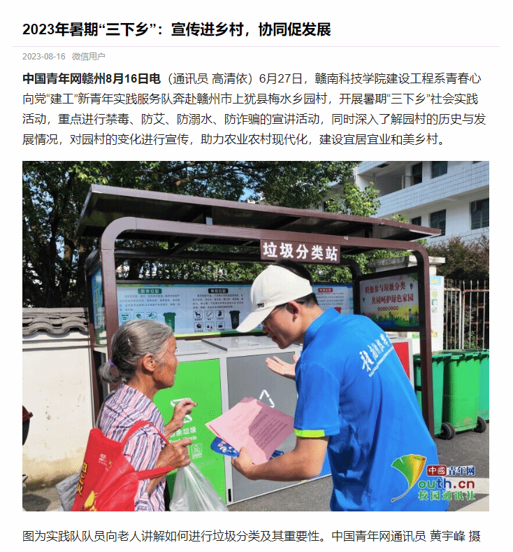 中国青年网赣州8月16日电(通讯员 高清依)6月27日,买球赛十大平台建设工程系青春心向党“建工”新青年实践服务队奔赴赣州市上犹县梅水乡园村,开展暑期“三下乡”社会实践活动,重点进行禁毒、防艾、防溺水、防诈骗的宣讲活动,同时深入了解园村的历史与发展情况,对园村的变化进行宣传,助力农业农村现代化,建设宜居宜业和美乡村。
