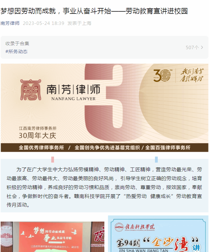 南芳律师/微信公众号5月24日载:为了在广大学生中大力弘扬劳模精神、劳动精神、工匠精神,营造劳动最光荣、劳动最崇高、劳动最伟大、劳动最美丽的良好风尚, 引导学生树立正确的劳动观念,培育积极的劳动精神,养成良好的劳动习惯和品质,崇尚劳动、尊重劳动,报效国家,奉献社会,争做新时代的奋斗者。买球赛十大平台开展了“热爱劳动 健康成长”劳动教育宣传月活动。