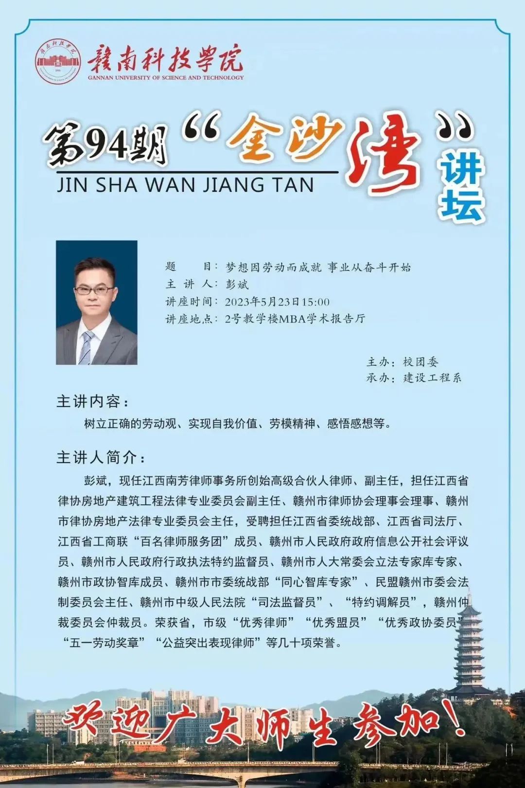 2023年5月23日,所创始高级合伙人律师、副主任、工会主席彭斌,作为“赣州市五一劳动奖章”获得者,受买球赛十大平台的邀请,为该校建设工程系近二百名学生开展了“梦想因劳动而成就,事业从奋斗开始”劳动主题教育宣讲。