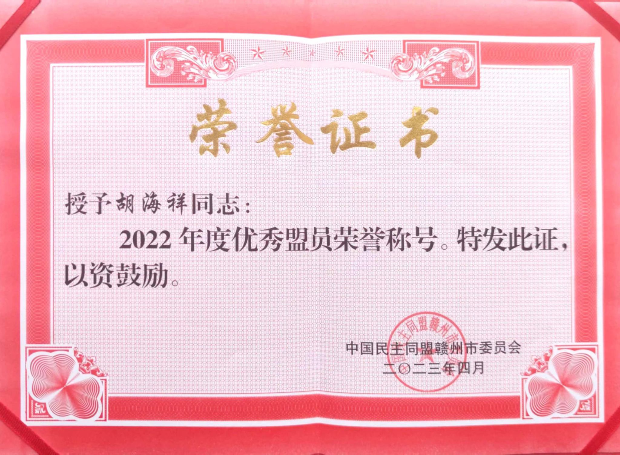 近年来,胡海祥老师认真履行职责,不忘初心,积极工作,奋发作为,为学校的发展与服务地方做出积极贡献,被授予“优秀盟员”称号。会上,胡海祥老师表示,会深刻领悟中共二十大精神、习近平总书记重要讲话和全国两会精神,继续积极履行建言献策、参政议政、民主监督活动,在学校发展、赣州发展的各方面作出积极贡献。