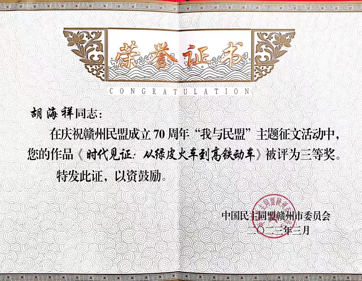 会上,胡海祥同志的作品《时代见证:从绿皮火车到高铁动车》在庆祝赣州民盟成立70周年“我与民盟”主题征文活动中荣获三等奖。