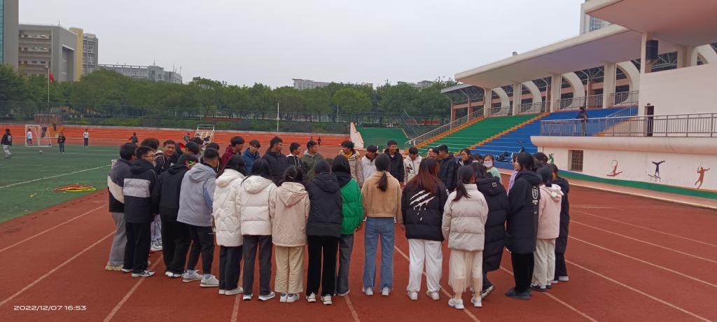 本网讯:为了提高班级凝聚力,促进师生感情,加强同学们德智体美全面发展,12月7日下午,心理咨询中心于田径场举行“提高班级凝聚力——打开你的心扉”大学生心理健康主题活动,刘运梅老师、邱麟惠老师以及造价222班全体成员参加此次活动。