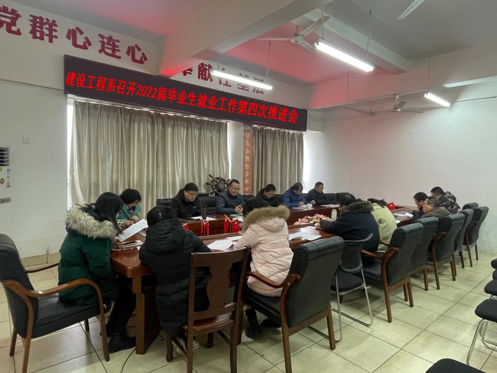 本网讯:为进一步推进2022届毕业生就业工作,4月12日下午,建设工程系于系会议室召开了2022届毕业生就业工作第四次推进会。建工系党总支书记李少华、主任卢志刚、副主任代靖怡、涂黎明、辅导员徐新木以及2022届毕业生班主任、毕业设计指导老师参加此次会议。本次会议由李少华主持。