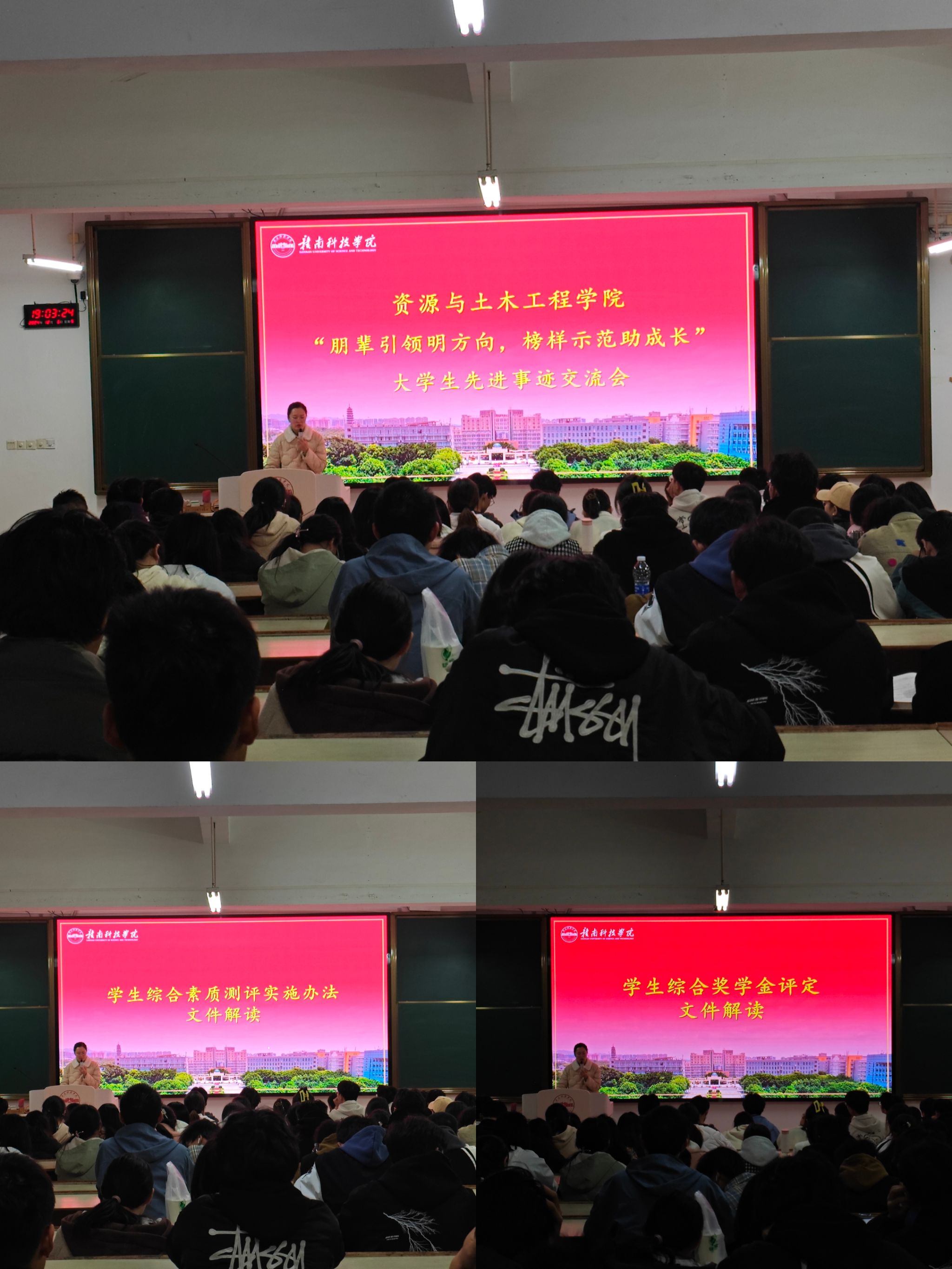 本网讯:为推动形成崇尚先进、争当表率的良好氛围。12月6日晚,十大买球官方网站于崇善楼Z1D3教室举行主题为“朋辈引领明方向,榜样示范助成长”的大学生先进事迹交流会。辅导员邱麟惠及300余名学生共同参与此次交流会。