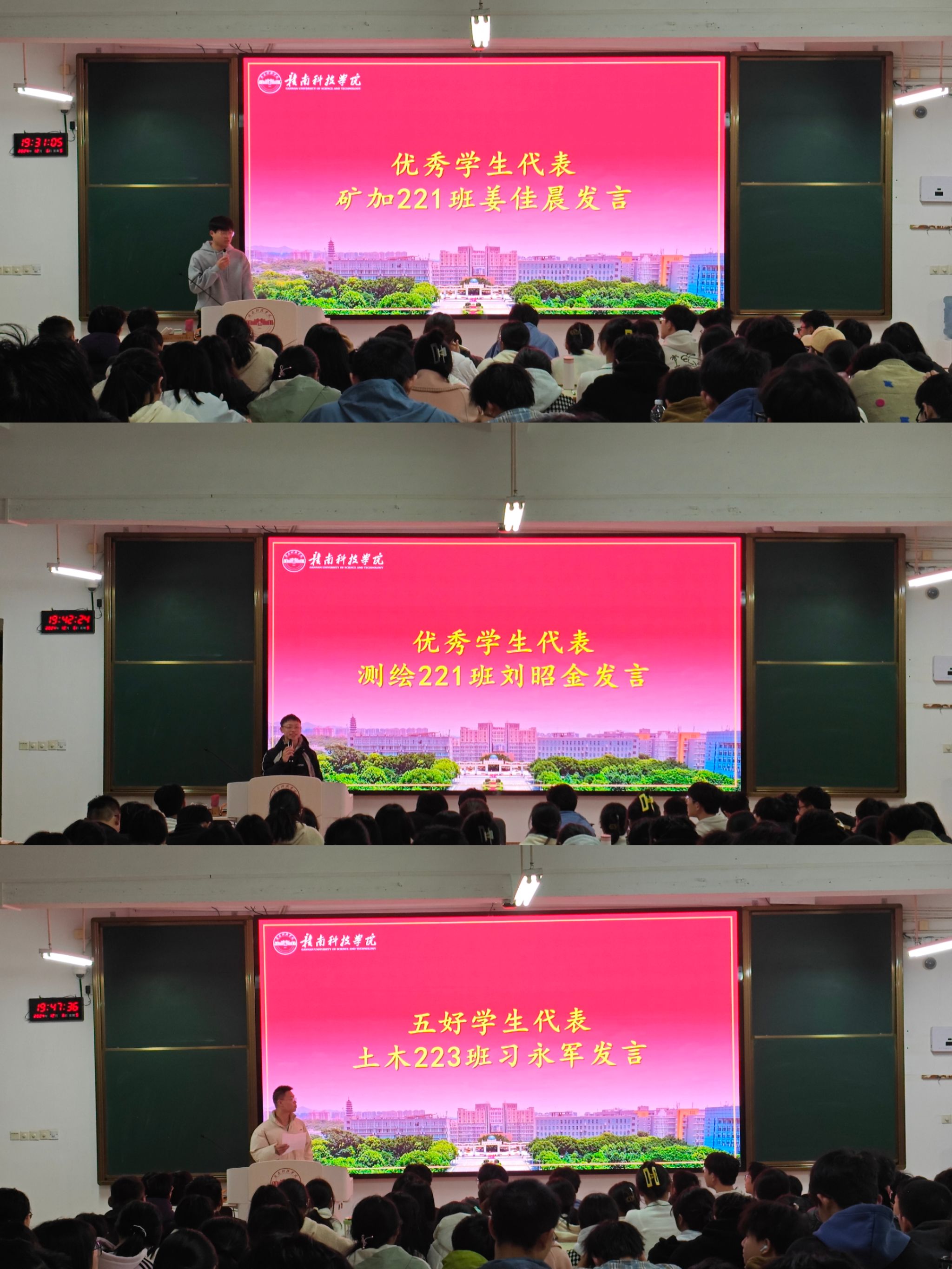 会上,优秀学生代表矿加221班姜佳晨、测绘221班刘昭金及五好学生代表土木223班习永军三位同学上他们结合自己的专业特色和学习生活做交流发言,分享了各自的宝贵经验。他们分别从不同方面阐述了如何平衡学业与竞赛、兴趣与社会实践,实现个人综合素质的提升。三位同学的发言不仅展现了他们在各自专业的实践成果,更传递了勇于探索、持续学习、全面发展的积极态度,为在场的学生提供了宝贵的启示与激励。