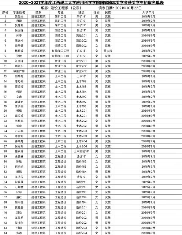 本网讯:资源与建筑工程学院(建设工程系)2020-2021学年国家励志奖学金初审名单公示:
