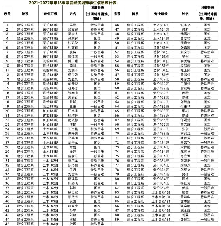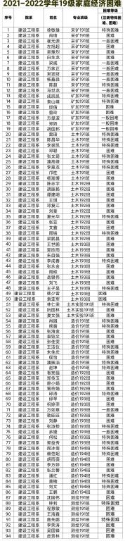本网讯:资源与建筑工程学院(建设工程系)2021-2022学年经济困难学生初审名单公示如下: