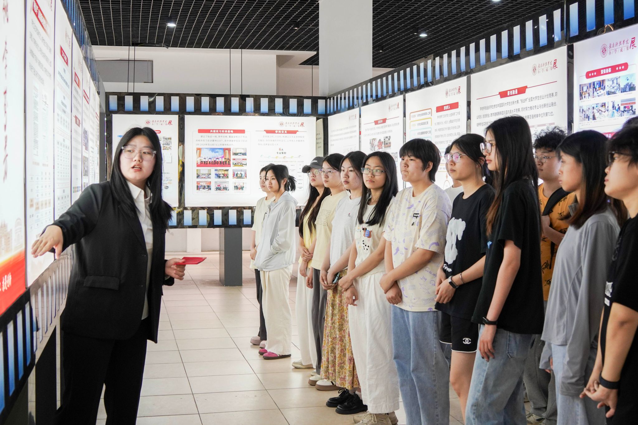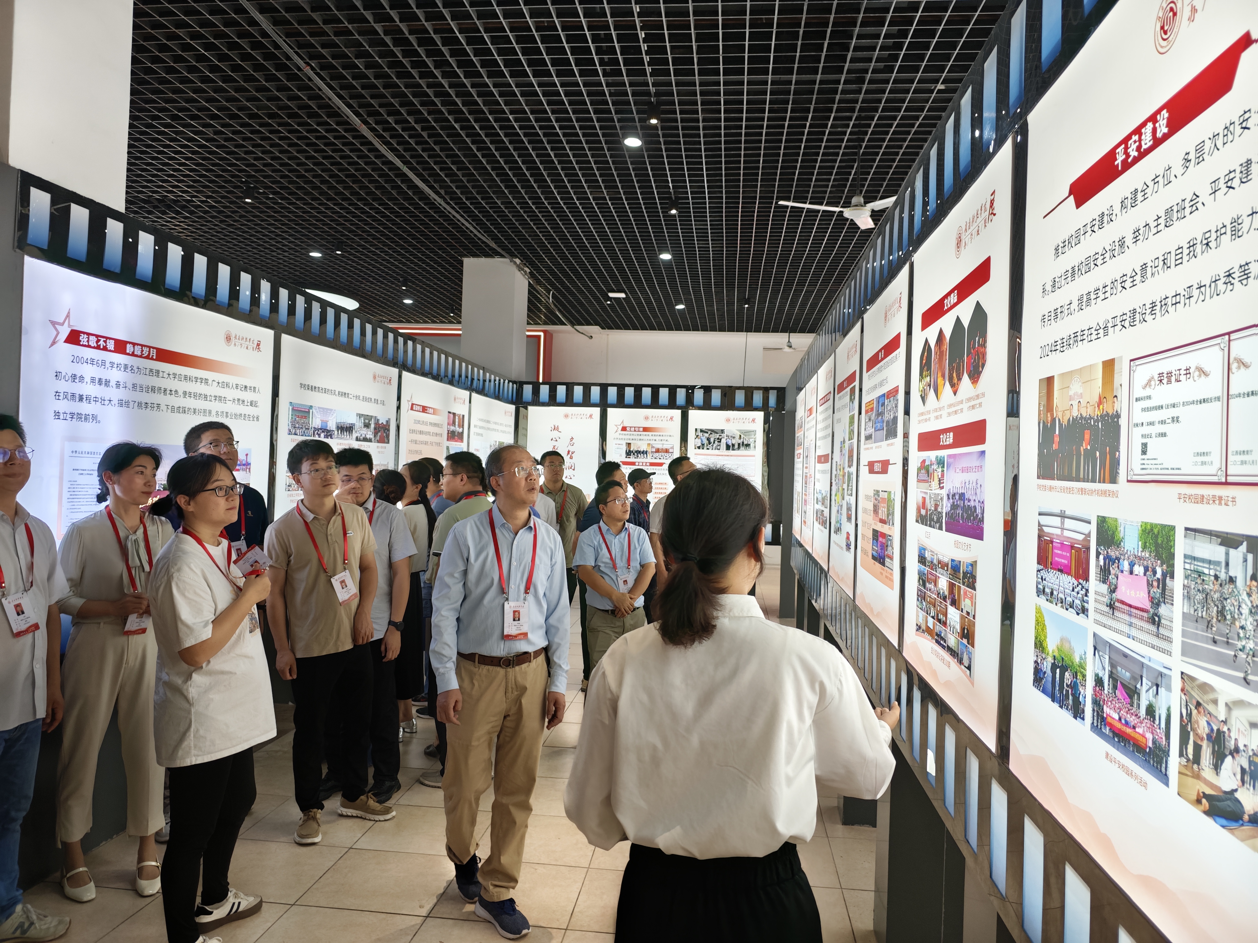 “我们的足迹”办学成果展是新生入学教育和学校思想政治教育的重要场所,主要展示了转设以来学校在党建思政、人才培养、师资建设、科学研究、社会服务、合作交流等方面的办学成果和办学特色。在讲解员的解说下,参展师生目不暇接,通过图文展板、实物模型、数据图表等近距离观看了学科竞赛作品、校园文化活动、人才队伍建设、科研创新项目成果、校企联合研发设备等,并通过互动问答、观看视频等形式,沉浸式感受学校育人实践成效。