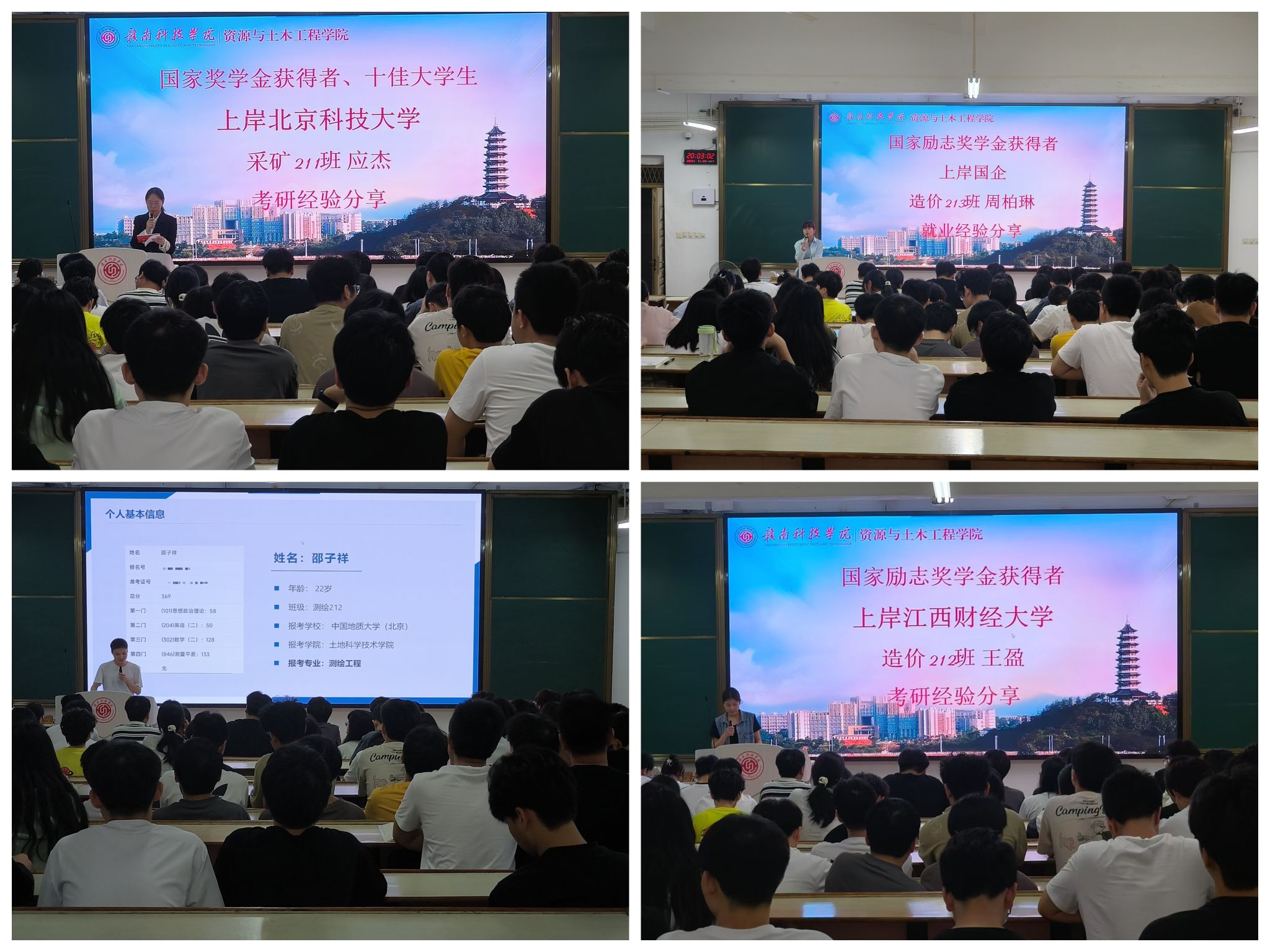 国家奖学金获得者、十佳大学生、采矿 211 班应杰已成功上岸北京科技大学,他围绕考研备考策略展开分享,强调 “明确目标 + 科学规划 + 坚持执行” 的重要性,鼓励学弟学妹勇于挑战自我,在学术道路上勇攀高峰。国家励志奖学金获得者、测绘 212 班邵子祥考取中国地质大学(北京),他以 “坚持与选择” 为关键词,分享了考研的心路历程,建议同学们结合兴趣与专业前景理性决策,用汗水浇灌梦想。造价212班王盈获国家励志奖学金并上岸江西财经大学,她聚焦考研心态调整,分享了 “化压力为动力” 的心得,鼓励大家在备考中保持积极心态,以扎实的知识储备应对挑战。造价 213 班周柏琳获国家励志奖学金并进入国企工作,她从职业规划角度出发,分享了求职经验,强调 “提前实习 + 技能提升 + 精准定位” 的重要性,建议同学们在大学期间注重实践积累,为就业做好充分准备。造价 214 班罗雪琴成功上岸省考公务员,她围绕考公备考策略,分享了行测与申论的复习技巧,建议同学们关注社会热点,提升逻辑思维与文字表达能力,在公共服务领域实现人生价值。五位同学的分享真诚且充满力量,现场掌声不断。他们用奋斗故事诠释了 “感恩、励志、担当” 的精神,为在场同学树立了可学可追的榜样。