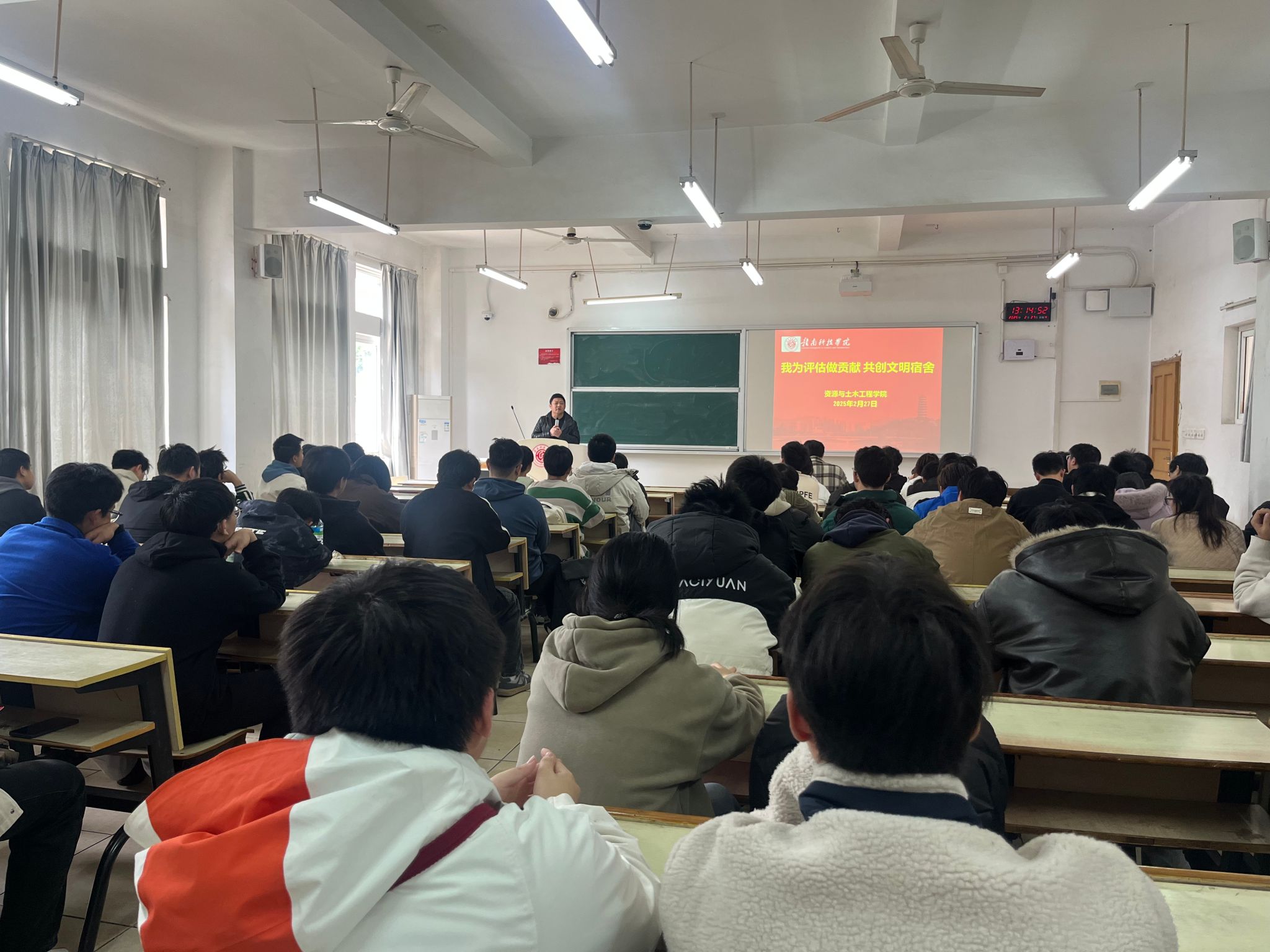 资土学院涂黎明老师围绕寝室文明建设进行动员。他表示,寝室文明在校园文化建设中占据着举足轻重的地位,一个整洁、和谐、积极向上的寝室环境是文明和谐美丽校园的重要组成部分。涂黎明对各班班干提出要求,鼓励他们发挥模范带头作用,从自身做起,从小事做起,按时整理好自己的床铺,保持桌面整洁,督促室友遵守寝室规章制度,共创干净舒适寝室风尚。