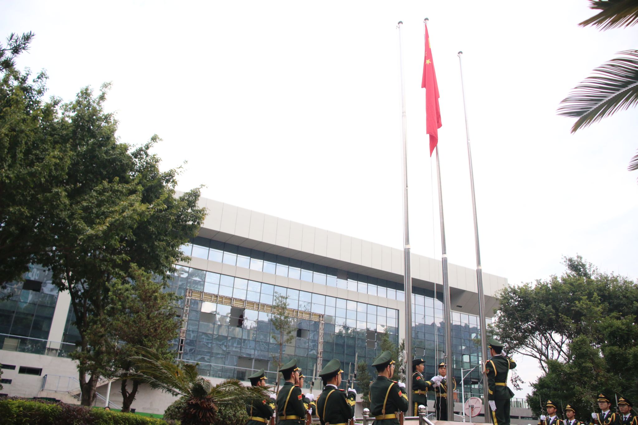 国旗护卫队迈着整齐划一、铿锵有力的步伐入场。伴随激昂的《义勇军进行曲》响起,鲜艳的五星红旗冉冉升起。全体师生神情肃穆,行注目礼,奏唱国歌。