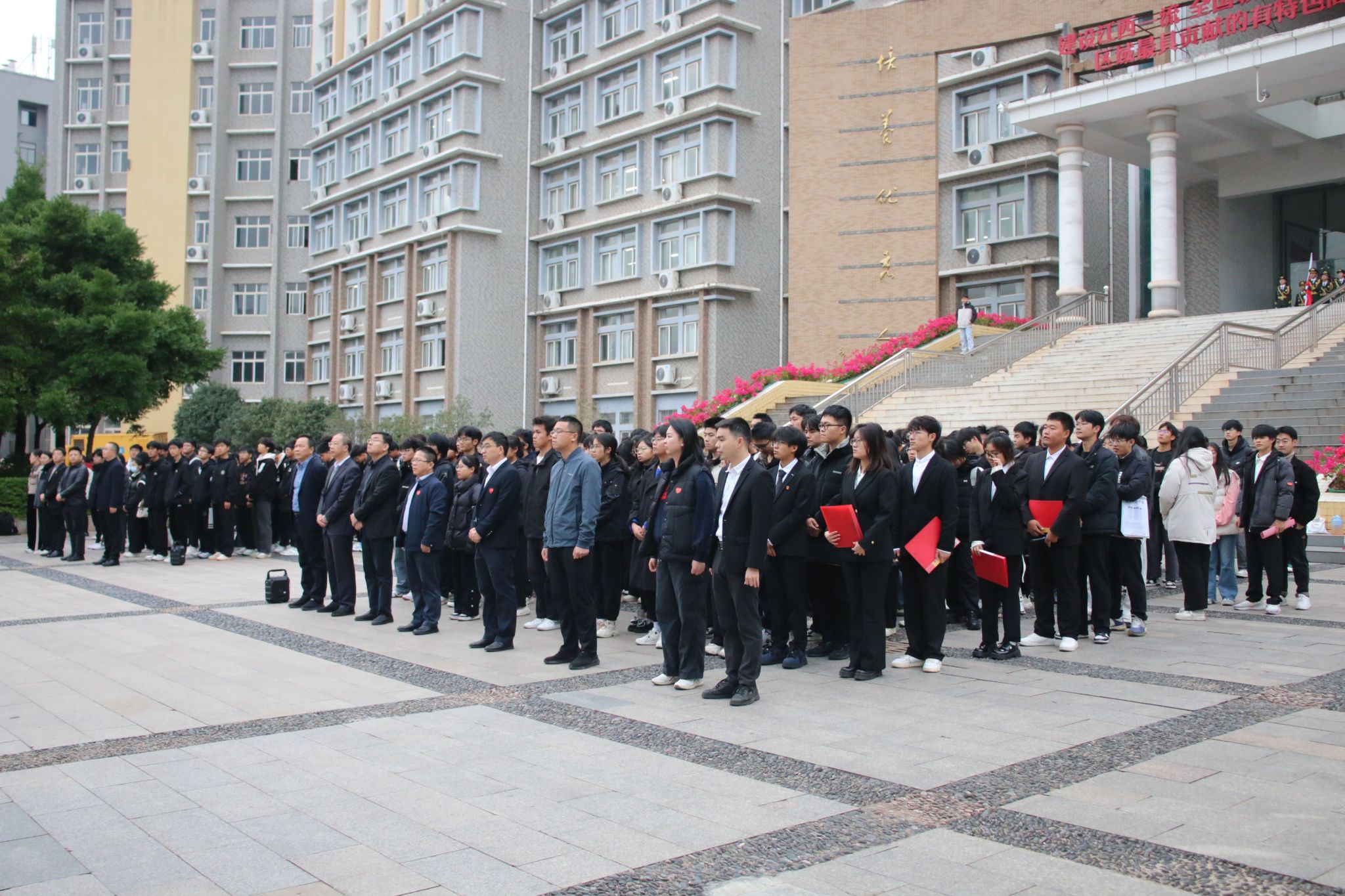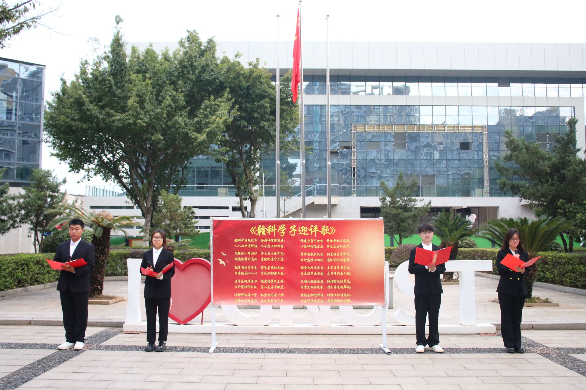 学生代表工程造价241班郑玉洁开展作“喜迎学校党代会,做拼搏贡献的赣科青年”为主题的国旗下演讲。她倡议十大买球官方网站学子应携手共进为学校合格评估添砖加瓦,围绕学校中心工作,服务大局,在学习生活、学科竞赛、志愿服务等方面贡献青春力量,献礼学校即将召开的第一次党代会,以更加饱满的热情、坚定的信心、扎实的行动争做拼搏奉献的新时代赣科青年。学生代表工程造价242班孙贺淇、工程造价242班谌业兴、工程造价242班刘思彤和土木工程241班徐奇翔共同领唱《赣科学子迎评歌》,全体师生齐声跟唱,此次升旗仪式在歌唱中圆满结束。