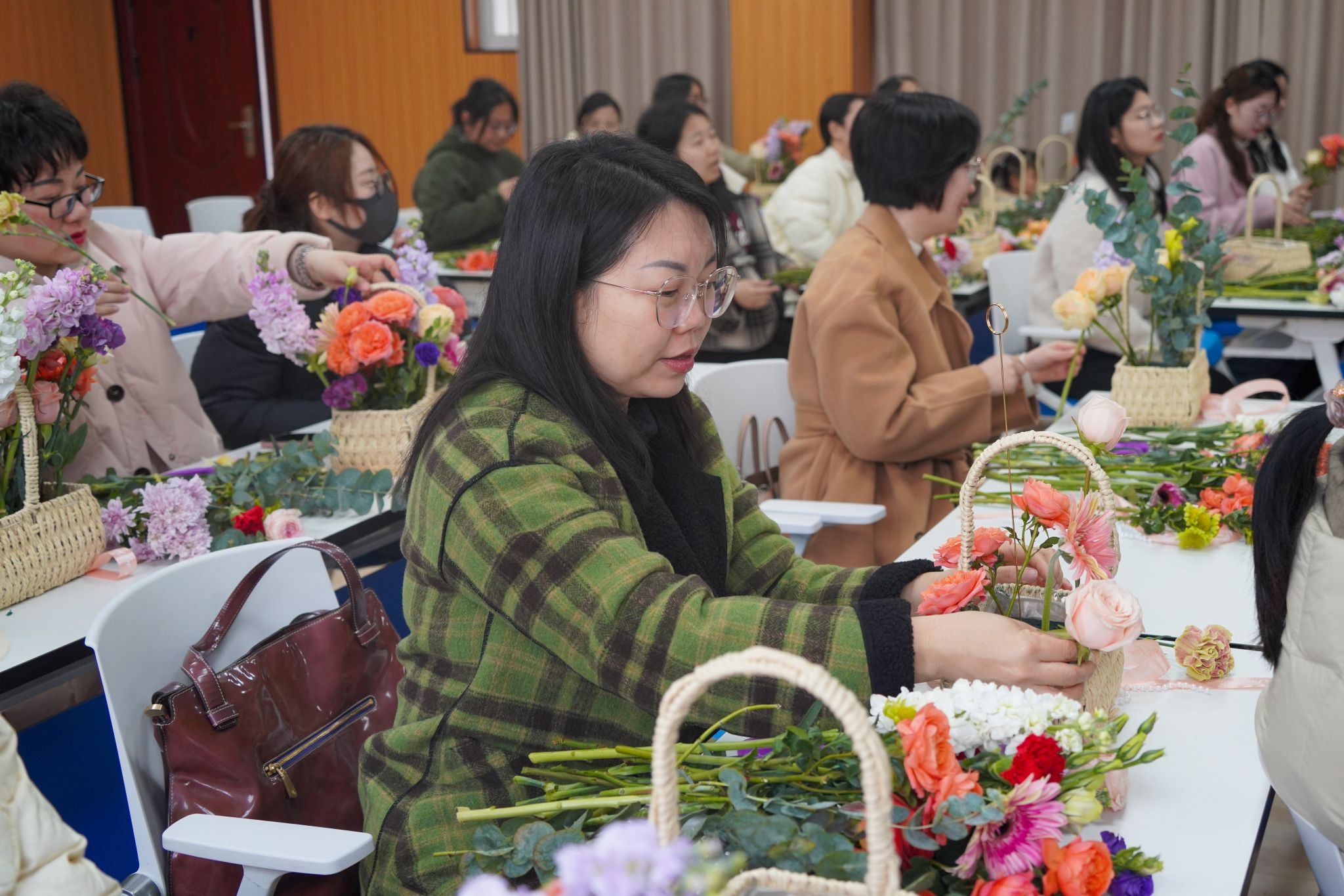 在氤氲花香中,花艺老师为教职工们讲解花朵种类、插花技巧、色彩搭配等知识,女教职工们发挥创意,修枝剪叶、构思造型,将各种花材巧妙搭配,创作出独具匠心的花艺作品,现场温馨满溢,欢声笑语不断。经过一个多小时的精心制作,一篮篮独具匠心、错落有致的插花作品逐渐成型,大家纷纷展示自己的作品并拍照留念。