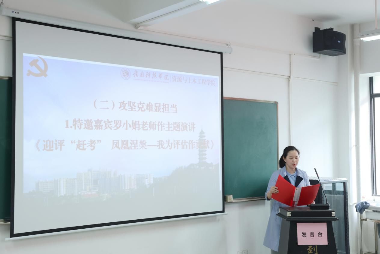 活动邀请了资土学院罗小娟老师作主题演讲《迎评“赶考”凤凰涅槃-----我为评估作贡献》。她结合自身教学经验和实际案例,深入剖析了评估工作对学校发展、教师成长和学生成才的关键作用,鼓励在场师生党员以高度的责任感和使命感,积极投身到评估工作中去,从日常教学、学习生活的点滴做起,为学校评估工作添砖加瓦,助力学校在“迎评赶考”中实现凤凰涅槃般的蜕变。