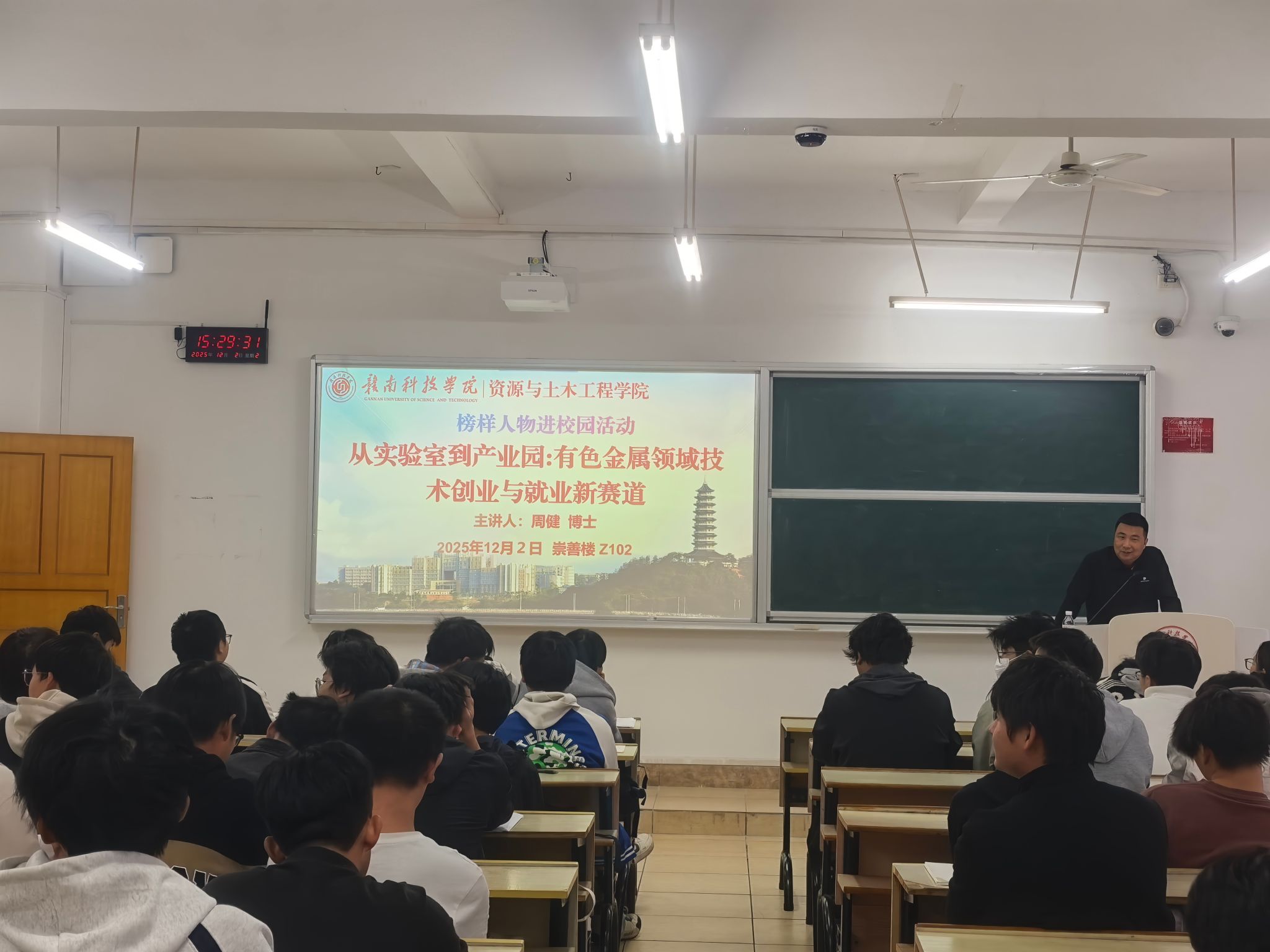 本网讯:为进一步发挥榜样引领效能,提升学子就业创业能力,做好大学生职业发展规划。12月2日下午,十大买球官方网站特邀苏区之光计划入选者、东南大学硕士生导师、高级工程师周健博士在崇善楼Z102开展题为“从实验室到产业园:有色金属领域技术创业与就业新赛道”创业就业专题讲座。十大买球官方网站2025级矿物加工工程专业学子聆听本次讲座。