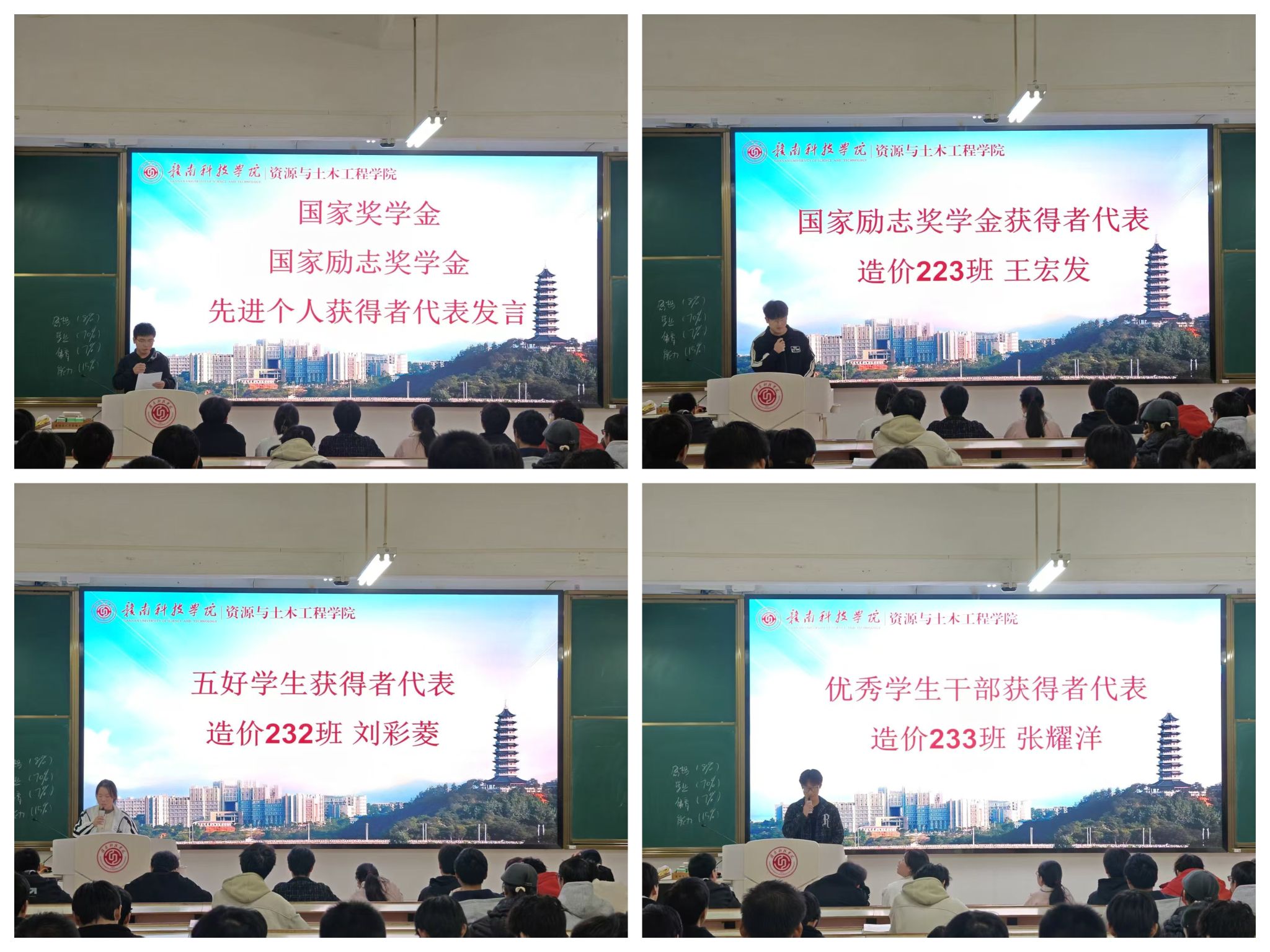 优秀学生代表发言环节中,九位不同领域的优秀学子登台分享,以亲身经历传递奋斗力量,为在场同学点亮前行航向。国家奖学金获得者、测绘232班张少康拆解高效学习与科研方法,解锁“深耕学业、勇攀高峰”的成长密码;国家励志奖学金获得者、造价223班王宏发分享逆风成长故事,诠释自强不息的精神内涵,引发全场共鸣。此外,五好学生代表刘彩菱、优秀学生干部代表张耀洋、学习进步先进个人朱福莲、体育工作先进个人王定新、社会工作先进个人全佳乐、社团工作先进个人杨欣怡、志愿服务先进个人钟学东,分别从全面发展、责任担当、自我突破、体育精神、实践服务、能力提升、爱心奉献等维度分享宝贵经验。九位学子以鲜活事迹展现十大买球官方网站学子笃实奋进、全面发展的青春风采,树立可感可学的榜样,传递“不负韶华、逐梦前行”的青春正能量。