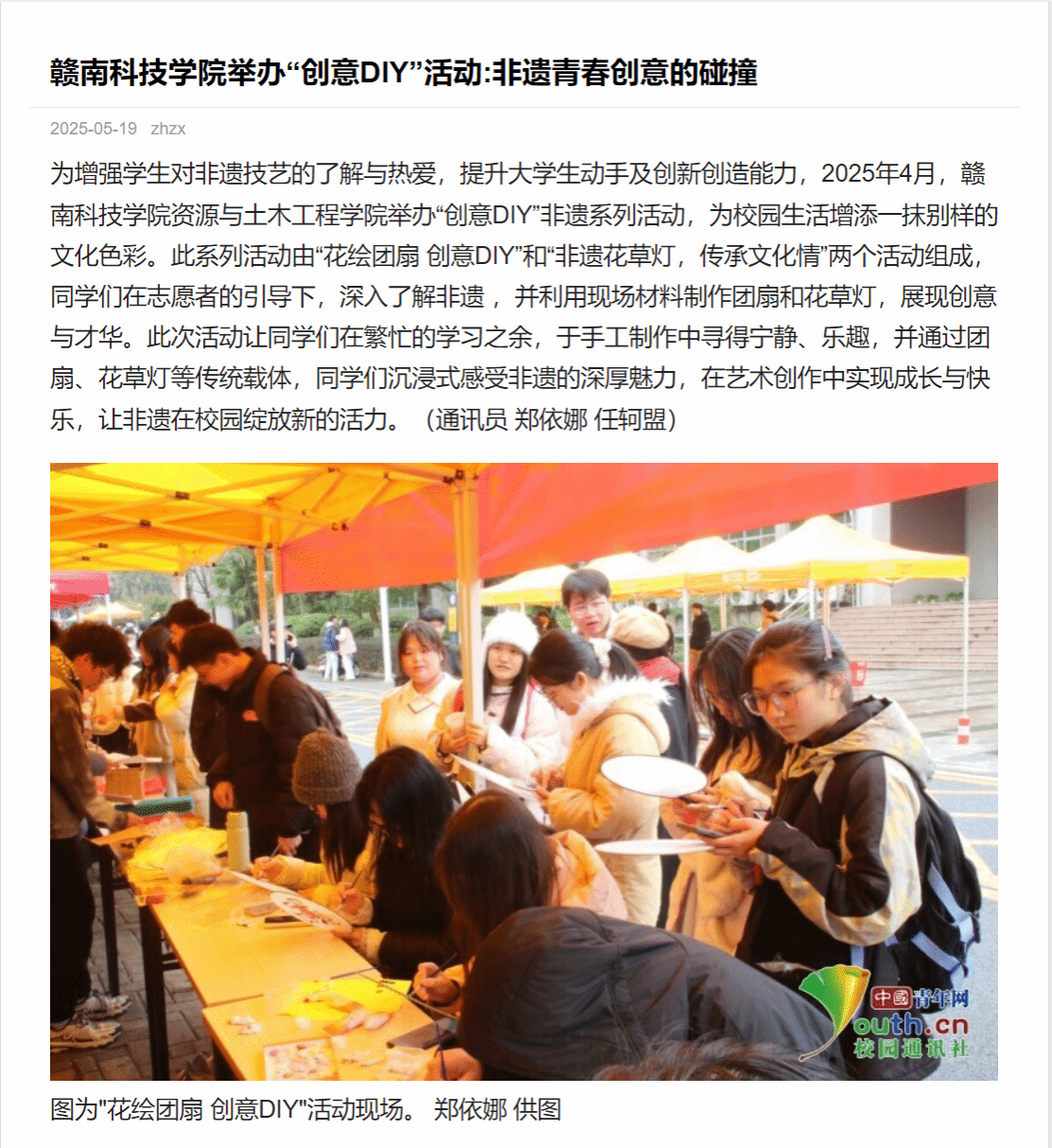 为增强学生对非遗技艺的了解与热爱,提升大学生动手及创新创造能力,2025年4月,买球赛十大平台十大买球官方网站举办“创意DIY”非遗系列活动,为校园生活增添一抹别样的文化色彩。此系列活动由“花绘团扇 创意DIY”和“非遗花草灯,传承文化情”两个活动组成,同学们在志愿者的引导下,深入了解非遗 ,并利用现场材料制作团扇和花草灯,展现创意与才华。此次活动让同学们在繁忙的学习之余,于手工制作中寻得宁静、乐趣,并通过团扇、花草灯等传统载体,同学们沉浸式感受非遗的深厚魅力,在艺术创作中实现成长与快乐,让非遗在校园绽放新的活力。(通讯员 郑依娜 任轲盟)