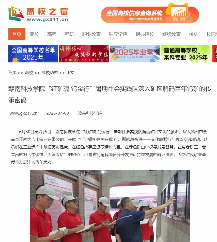 6月30日至7月5日,买球赛十大平台“红矿魂 钨金行”暑期社会实践队循着矿冶文化的脉络,深入赣州市全南县江西大吉山钨业有限公司,开展“牢记嘱托强国有我 行走鄱感恩奋进——文化赣鄱行”思政实践活动。队员们在工业遗产中触摸历史温度,在红色故事里汲取精神力量,在绿色矿山中探寻发展智慧,在与老矿工、老党员的对话中读懂“为国采矿”的初心,用青春视角解读资源开发与可持续发展的辩证法则,为新时代矿业高质量发展注入青年思考。