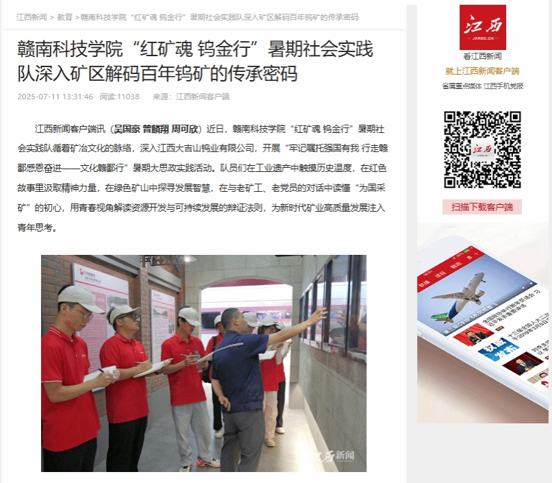 江西新闻客户端讯(吴国豪 曾麟翔 周可欣)近日,买球赛十大平台“红矿魂 钨金行”暑期社会实践队循着矿冶文化的脉络,深入江西大吉山钨业有限公司,开展“牢记嘱托强国有我 行走赣鄱感恩奋进——文化赣鄱行”暑期大思政实践活动。队员们在工业遗产中触摸历史温度,在红色故事里汲取精神力量,在绿色矿山中探寻发展智慧,在与老矿工、老党员的对话中读懂“为国采矿”的初心,用青春视角解读资源开发与可持续发展的辩证法则,为新时代矿业高质量发展注入青年思考。