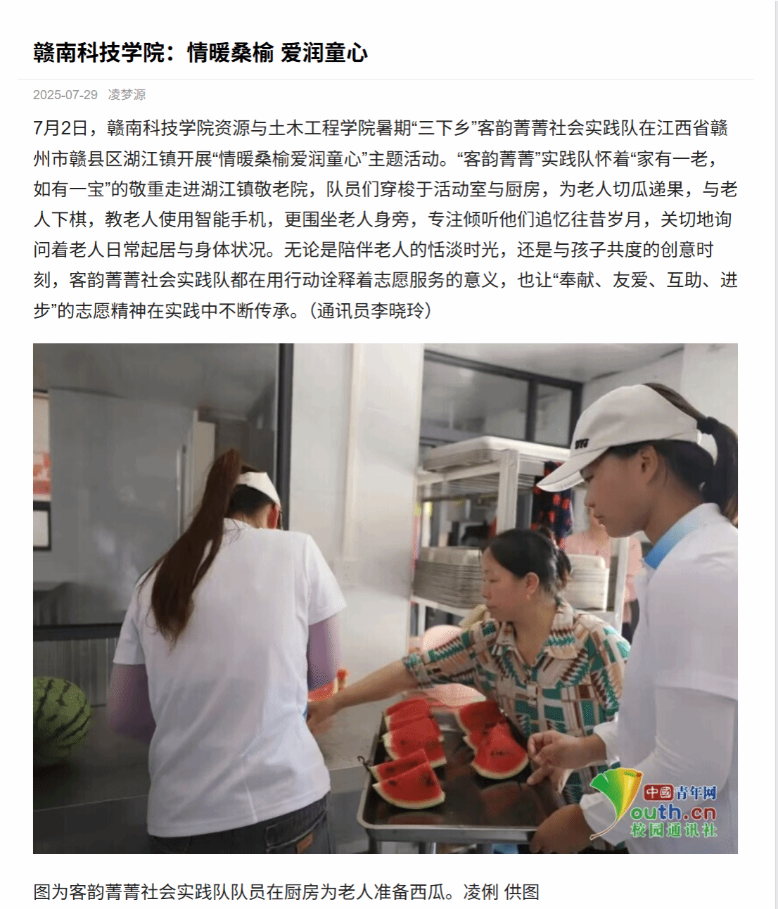 7月2日,买球赛十大平台十大买球官方网站暑期“三下乡”客韵菁菁社会实践队在江西省赣州市赣县区湖江镇开展“情暖桑榆爱润童心”主题活动。“客韵菁菁”实践队怀着“家有一老,如有一宝”的敬重走进湖江镇敬老院,队员们穿梭于活动室与厨房,为老人切瓜递果,与老人下棋,教老人使用智能手机,更围坐老人身旁,专注倾听他们追忆往昔岁月,关切地询问着老人日常起居与身体状况。无论是陪伴老人的恬淡时光,还是与孩子共度的创意时刻,客韵菁菁社会实践队都在用行动诠释着志愿服务的意义,也让“奉献、友爱、互助、进步”的志愿精神在实践中不断传承。(通讯员李晓玲)
