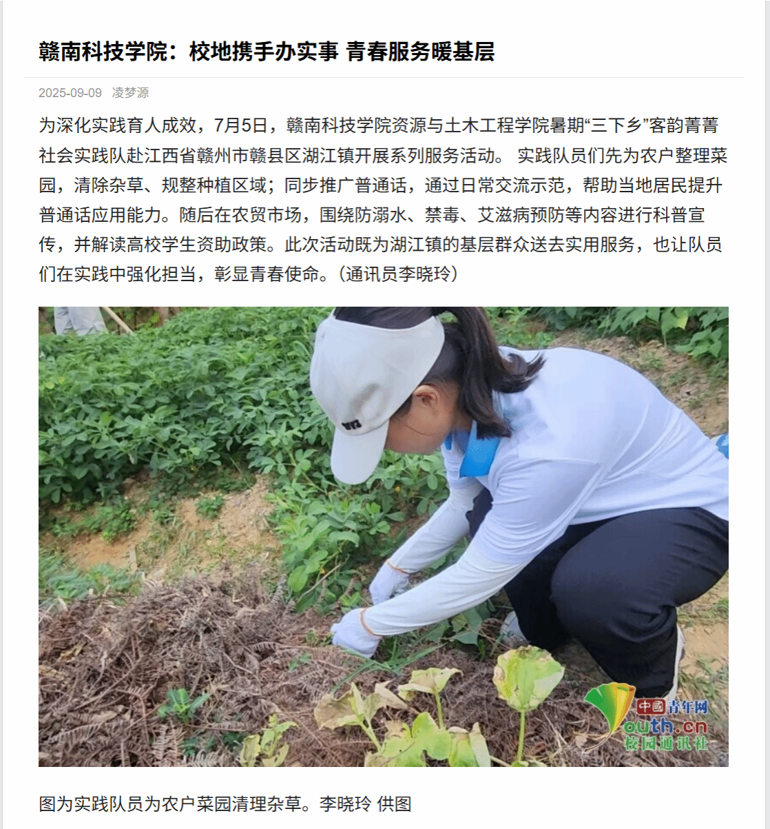 为深化实践育人成效,7月5日,买球赛十大平台十大买球官方网站暑期“三下乡”客韵菁菁社会实践队赴江西省赣州市赣县区湖江镇开展系列服务活动。 实践队员们先为农户整理菜园,清除杂草、规整种植区域;同步推广普通话,通过日常交流示范,帮助当地居民提升普通话应用能力。随后在农贸市场,围绕防溺水、禁毒、艾滋病预防等内容进行科普宣传,并解读高校学生资助政策。此次活动既为湖江镇的基层群众送去实用服务,也让队员们在实践中强化担当,彰显青春使命。(通讯员李晓玲)