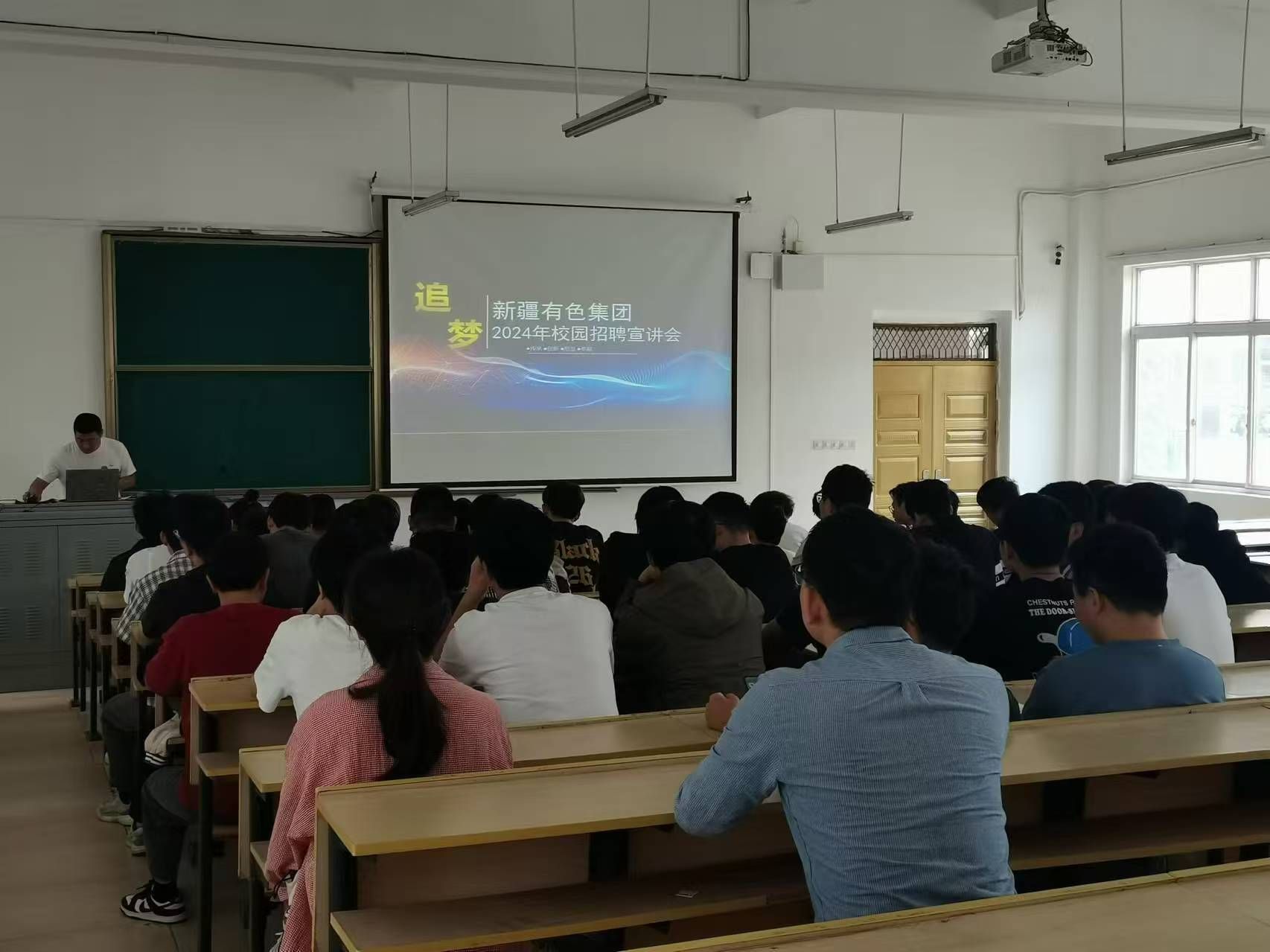 新疆有色金属工业(集团)有限责任公司(简称“新疆有色集团”)是以有色及贵金属、稀有金属、黑色金属、非金属资源开发为主,集地质勘查、采选冶、科研设计、建筑安装为一体的大型企业集团。新疆有色人力专员李鹏飞详细介绍了公司的发展历程、业务领域、人才需求、职业发展等信息,表示公司会为毕业生提供充足的发展空间和良好的成长平台,真诚地欢迎同学们加入新疆有色实现自己的梦想。
