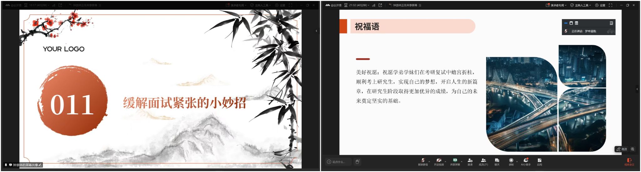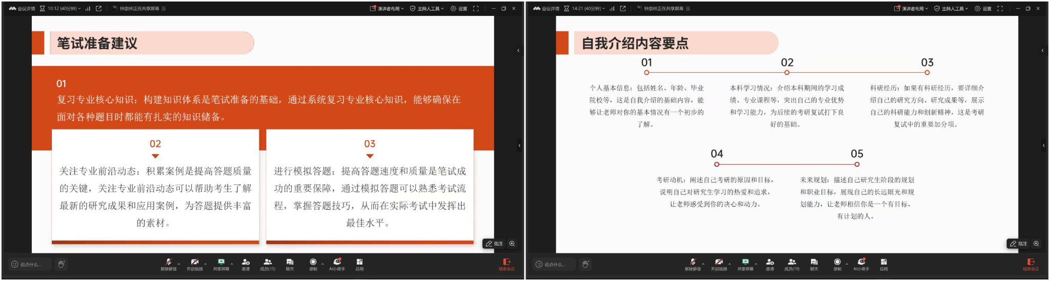 本网讯:为深入推进学风建设,全力帮助考研学子顺利通过复试,3月23日,十大买球官方网站借助线上平台举办考研复试指导交流会。本次会议由刘波老师主持,特别邀请了钟崇林、汤燕、左旭超三位在读研究生校友担任主讲嘉宾,为即将踏入复试考场的同学们倾囊相授复试经验。