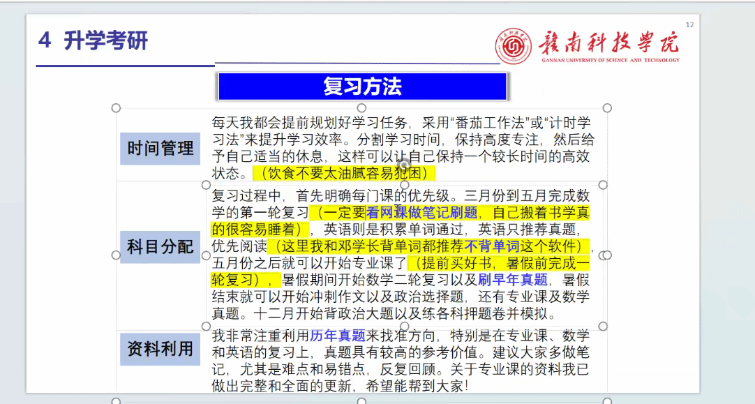 在专业认知方面,张松同学介绍到,土木工程专业实用性强,广泛应用于城市建筑、交通设施等领域,是推动社会发展的重要力量。但要在该领域有所建树,作为一名大学生,不仅要掌握结构力学、材料力学等专业知识,还需积极参与实践项目,提升实操能力。在考研经验分享环节,邓锋锐详细介绍了备考经验。他分享到,明确考研目标是第一步,学生应结合自身兴趣与职业规划,确定报考院校与专业。备考期间,需制定合理的学习计划,保证每日学习时间,循序渐进地积累知识。临近考试时,通过模拟考试查漏补缺,适应考试节奏。在复习规划上,他们分享了实用的方法。围绕数学、英语、政治、专业课分享经验,梳理知识框架。此外,邓锋锐还分享了专业课资料的更新,涵盖知识点总结、真题解析等内容,希望为学弟学妹的备考提供助力。
