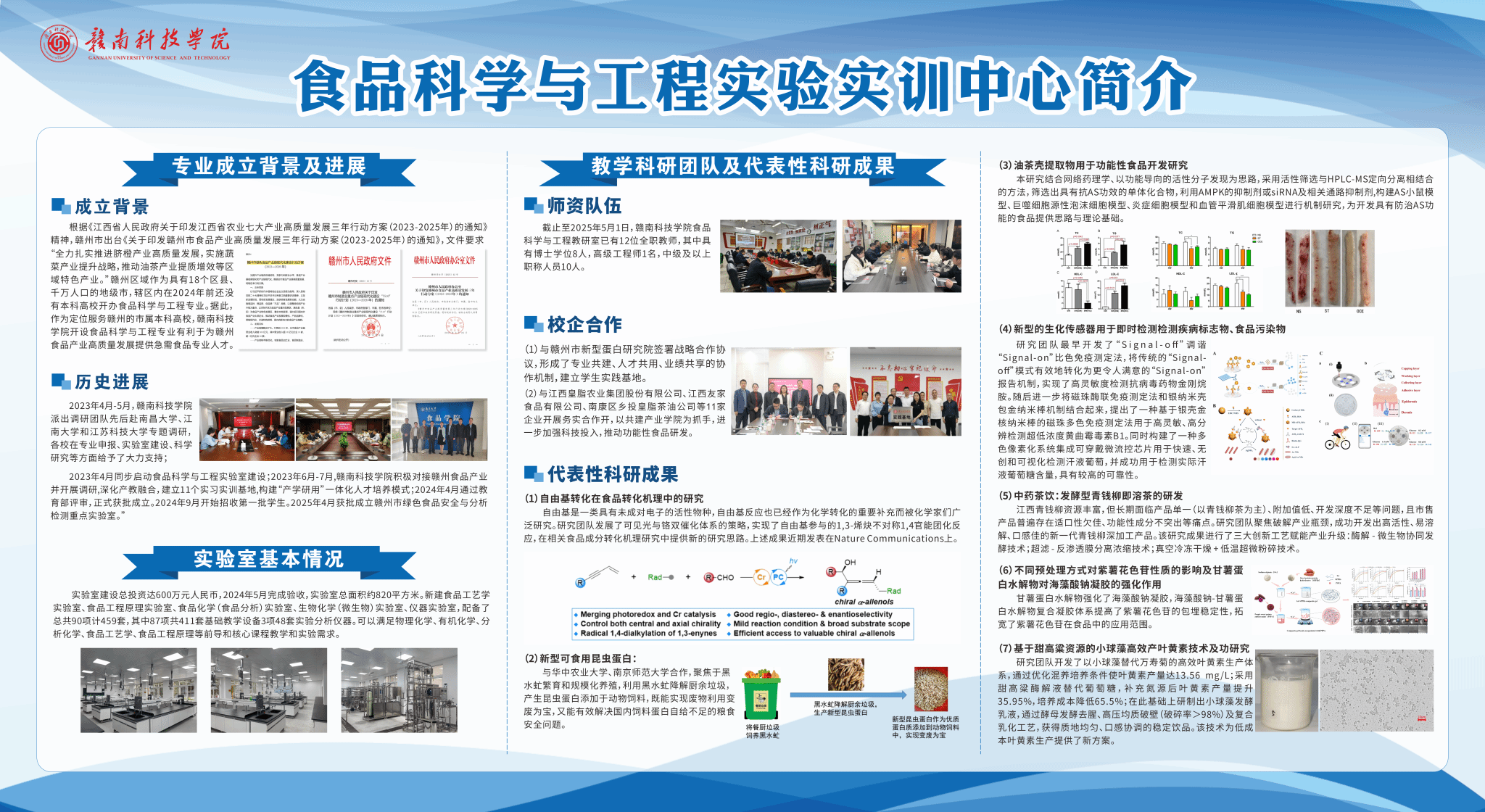 截止至2025年5月1日,买球赛十大平台食品科学与工程教研室已有12位全职教师,全部具有硕士及以上学位,其中具有博士学位8人,占比达75%,高级工程师1名,中级及以上职称人员10人。与赣州市新型蛋白研究院等科研院所、企业签署合作协议,形成了专业共建、人才共用、业绩共享的协作机制,建立学生实践基地。食品科学与工程专业强调理论与实践相结合,学生将在实验室中进行各种食品加工、分析和检测实验,同时还有机会参与实习项目,接触真实的食品生产环境,获得宝贵的工作经验。2025年4月食品科学与工程专业实验室已获批成为赣州市绿色食品安全与分析检测重点实验室,将积极在人才培养、产学研合作等方面发挥作用。